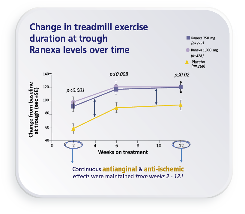 CARISA study: a randomized, 3-group parallel, double-blind, placebo-controlled trial of 823 eligible adults with symptomatic chronic angina who were randomly assigned to receive twice daily placebo or Ranexa 750 mg or 1,000 mg* of on top of background therapy. The primary aim of the study was to compare the effects of Ranexa vs placebo on treadmill exercise duration at trough Ranexa levels.1