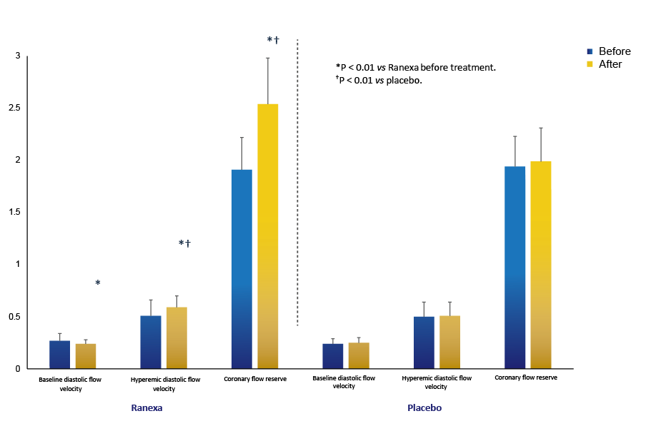 Double-blind, placebo controlled trial. Fifty-eight patients with angina and evidence of myocardial ischaemia, but no obstructive CAD, were assigned to Ranexa or placebo for 8 weeks (up to 500 mg twice a day). Coronary flow reserve and the Seattle Angina Questionnaire were assessed before and after 8-week therapy.1