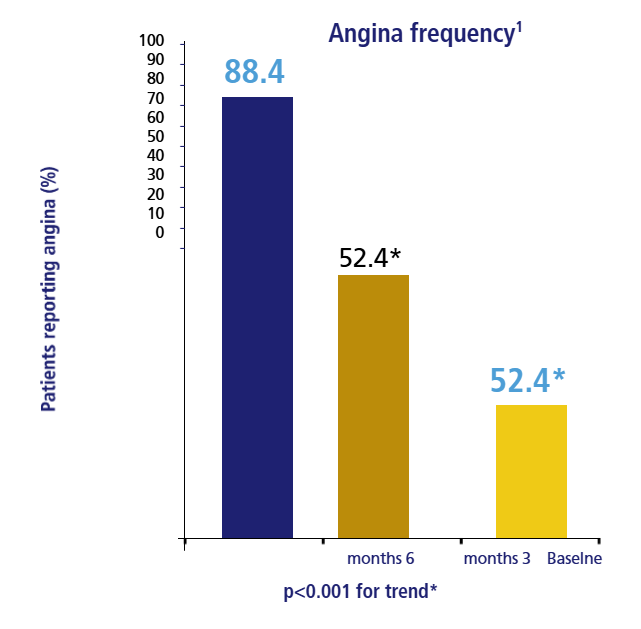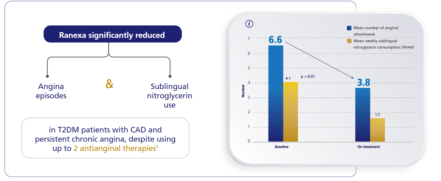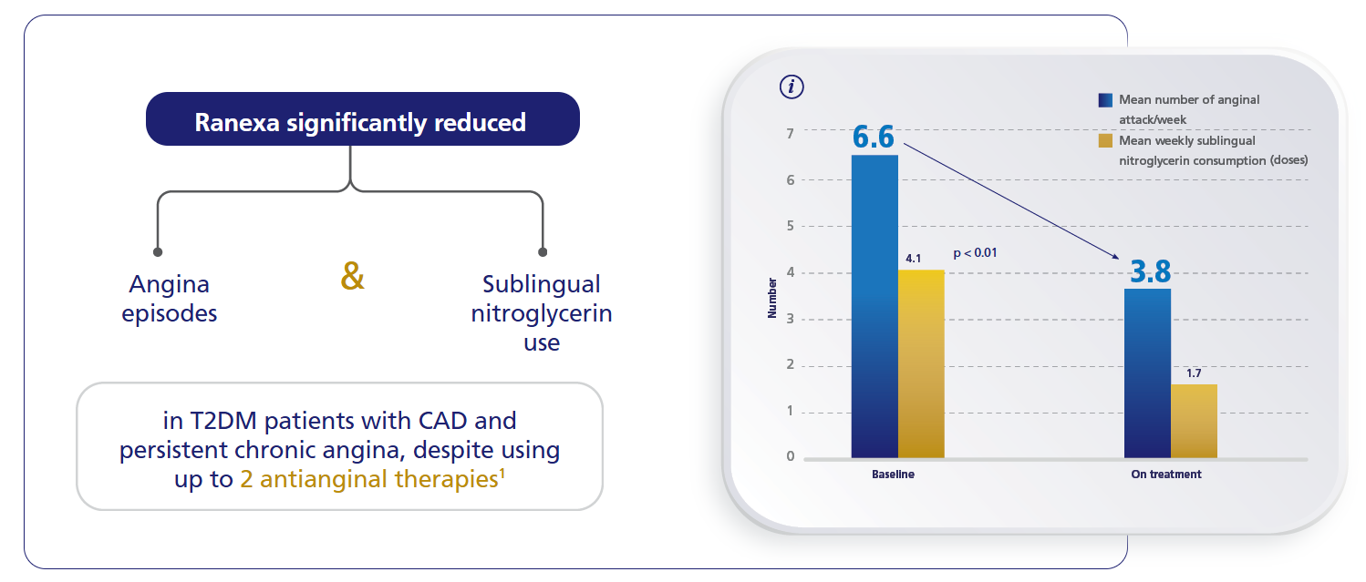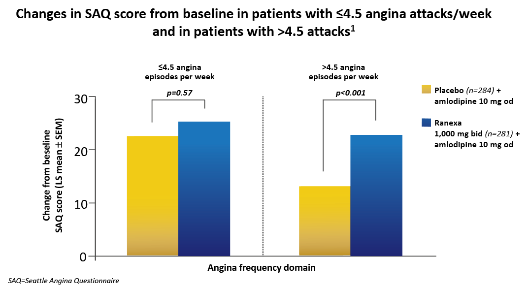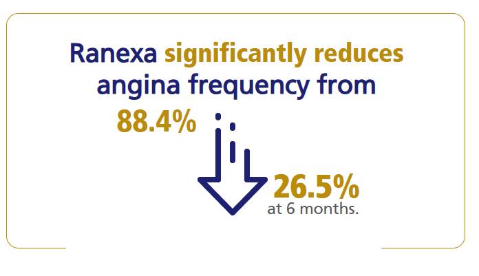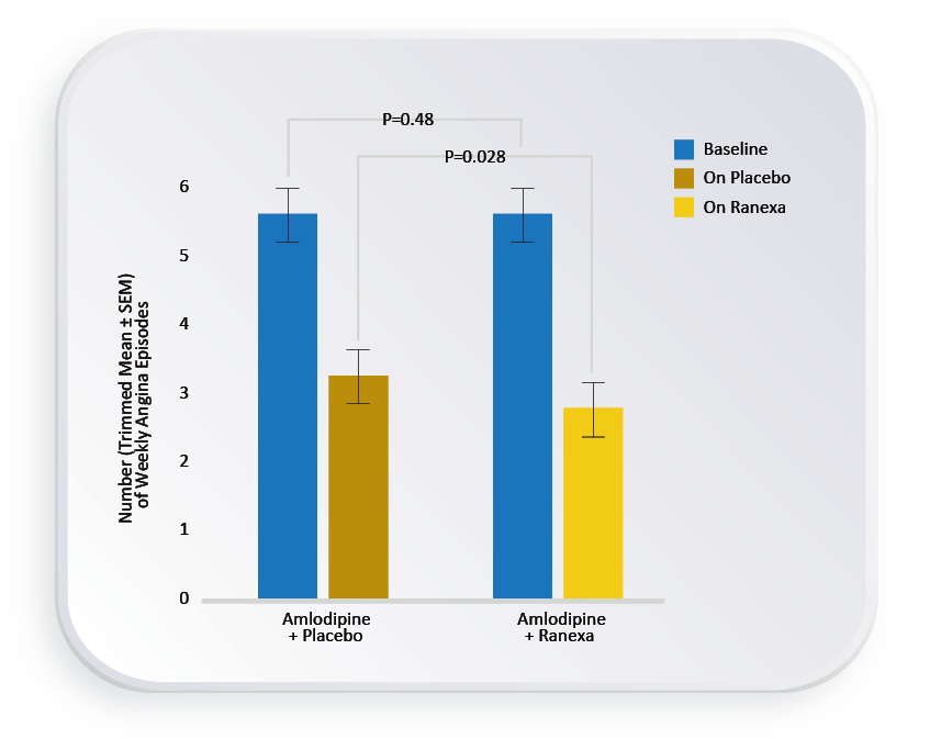ERICA study: stable patients (n = 565) with CAD and ≥3 attacks per week despite maximum recommended dosage of amlodipine (10 mg/day) were randomized to 1,000 mg* Ranexa or placebo twice a day for 6 weeks. Primary endpoint was the frequency of angina episodes per week during the double-blind treatment phase.1