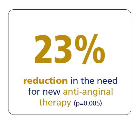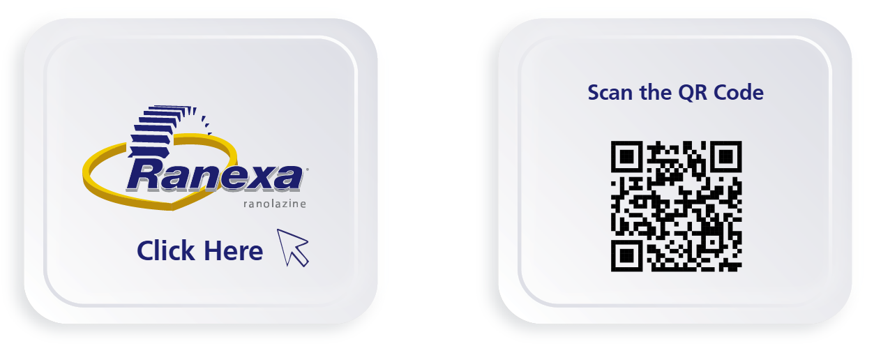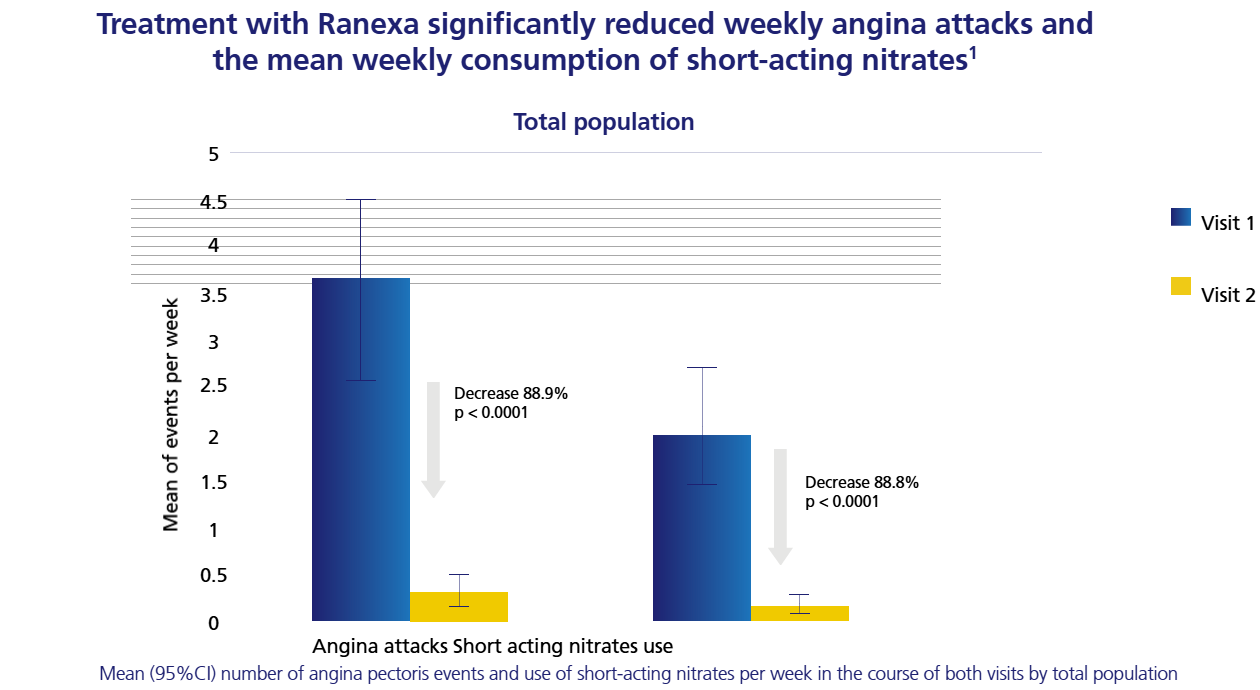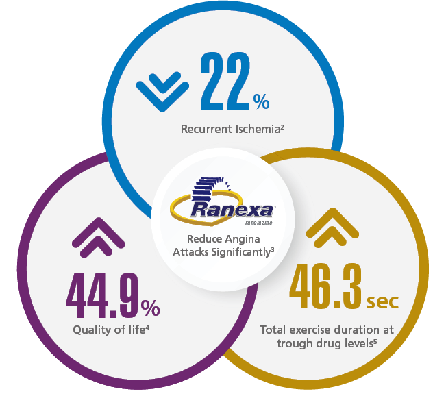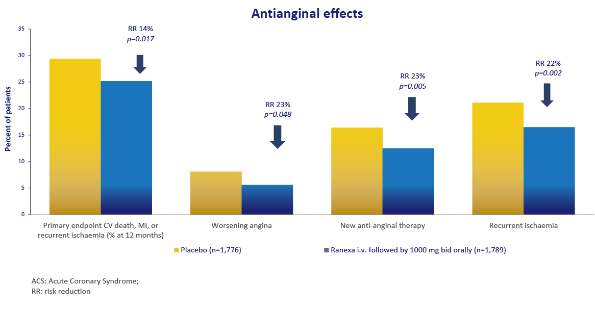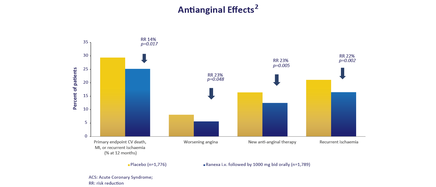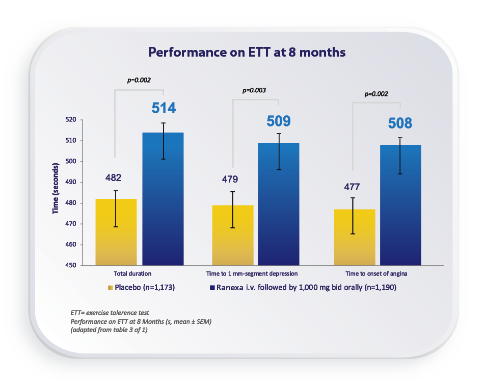 Pre-specified analysis of the antianginal efficacy and safety of Ranexa in the subgroup of 3,565 patients with a history of chronic angina who presented with an acute coronary syndrome (ACS) and were enrolled in the MERLIN–TIMI (Metabolic Efficiency with Ranexa for Less Ischaemia in Non-ST-Segment Elevation Acute Coronary Syndromes) 36 trial. MERLIN–TIMI 36 trial was a multinational, randomized, double-blind, placebo controlled parallel group trial of Ranexa (1,000 mg* twice daily) in patients with a non–ST-segment elevation ACS. After 12 to 96 h of the intravenous formulation, study medication (Ranexa extended-release or placebo) was to be continued orally at a dose of 1,000 mg* twice daily until the end of the study. The primary efficacy end point of the trial was the first occurrence of any element of the composite of cardiovascular death, myocardial infarction (MI), or recurrent ischaemia and did not differ between Ranexa and placebo. End points specifically designed to assess the efficacy of Ranexa as antianginal therapy included worsening angina the need for an increase or addition of any antianginal therapy, and exercise duration on treadmill or bicycle ETT performed at 8 months (or final visit whichever was sooner).1