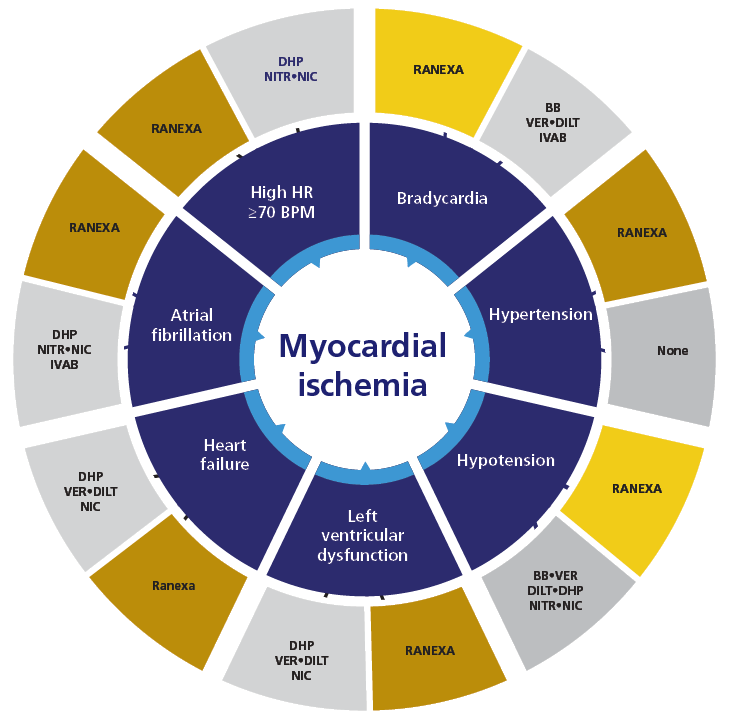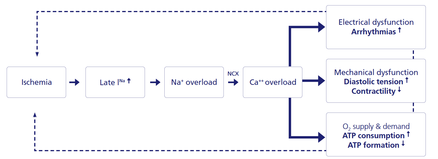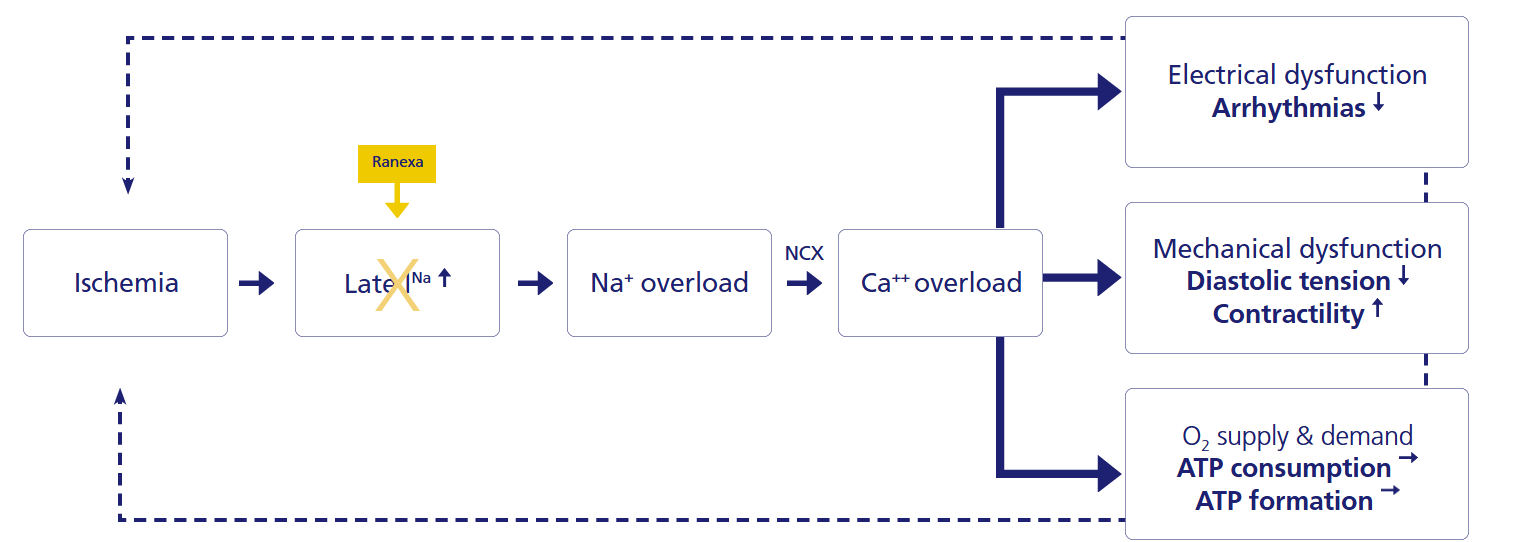 Ranexa has been shown to be a potent inhibitor of late INa and therefore interrupts a major step in the pathophysiology of myocardial ischaemia.1