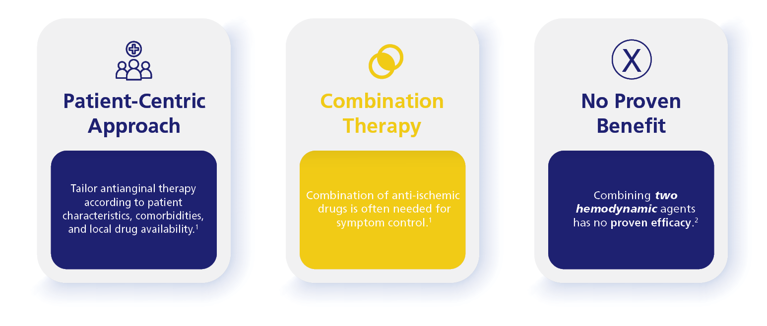 First line: Beta blocker Second line: non DHP- CCB substituted where beta blockers are not tolerated or ineffective. Third line: Add-in therapy CCB-DHP-only for those on beta blockers Nicorandil* (unavailable in the USA) Ranexa |
