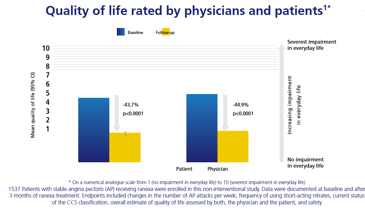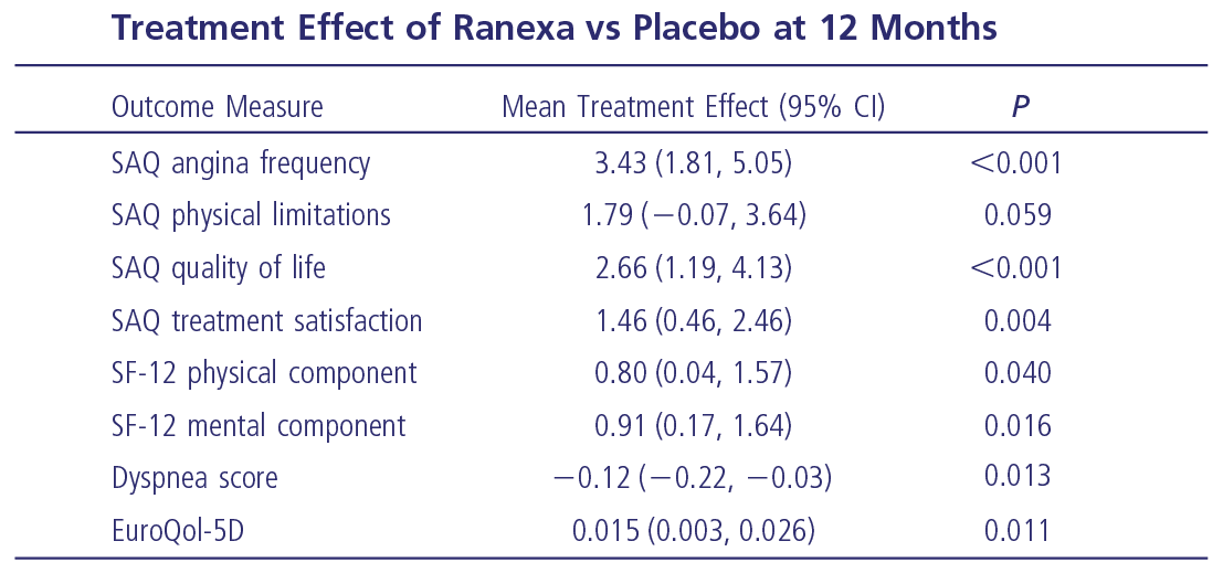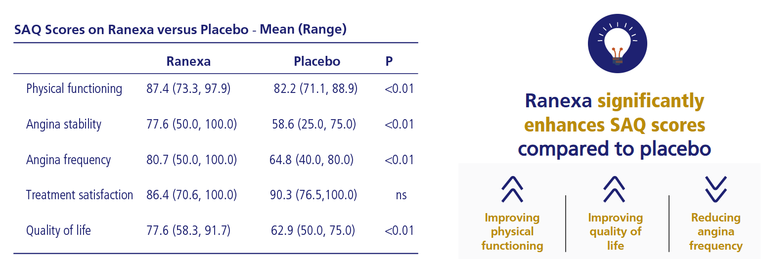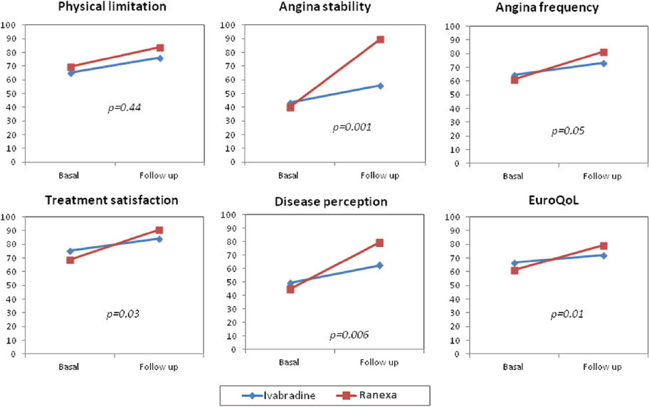 SAQ items and EuroQoL VAS improved significantly in both ivabradine and Ranexa groups, whereas no changes were observed in group placebo. Comparisons of ivabradine and Ranexa groups showed that Ranexa achieved better results for several SAQ items and for the EuroQoL VAS.
