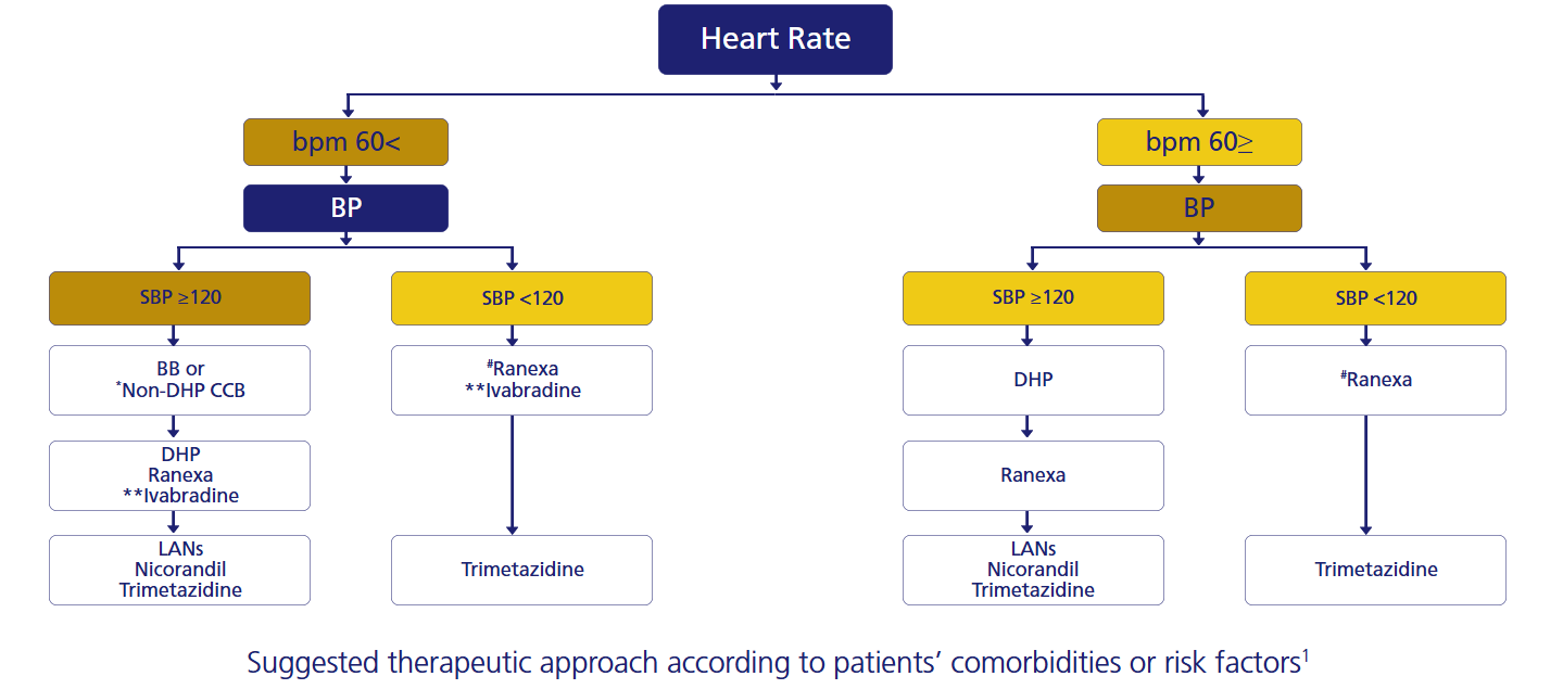 **heart rate > 70 bpm; BB = beta blocker; CCB = calcium channel blocker; DHP = dihydropyridine; SBP = systolic blood pressure; LANs = long acting nitrates. (modified from fig. 1 of 1)
