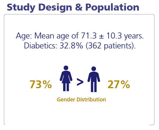 Study Population: Eligible patients were adults with stable AP who recently started Ranexa treatment. Of 1,101 enrolled, 73.3% were men, 27.7% were women, and 32.8% were diabetic. Mean age was 71.3 years.1
